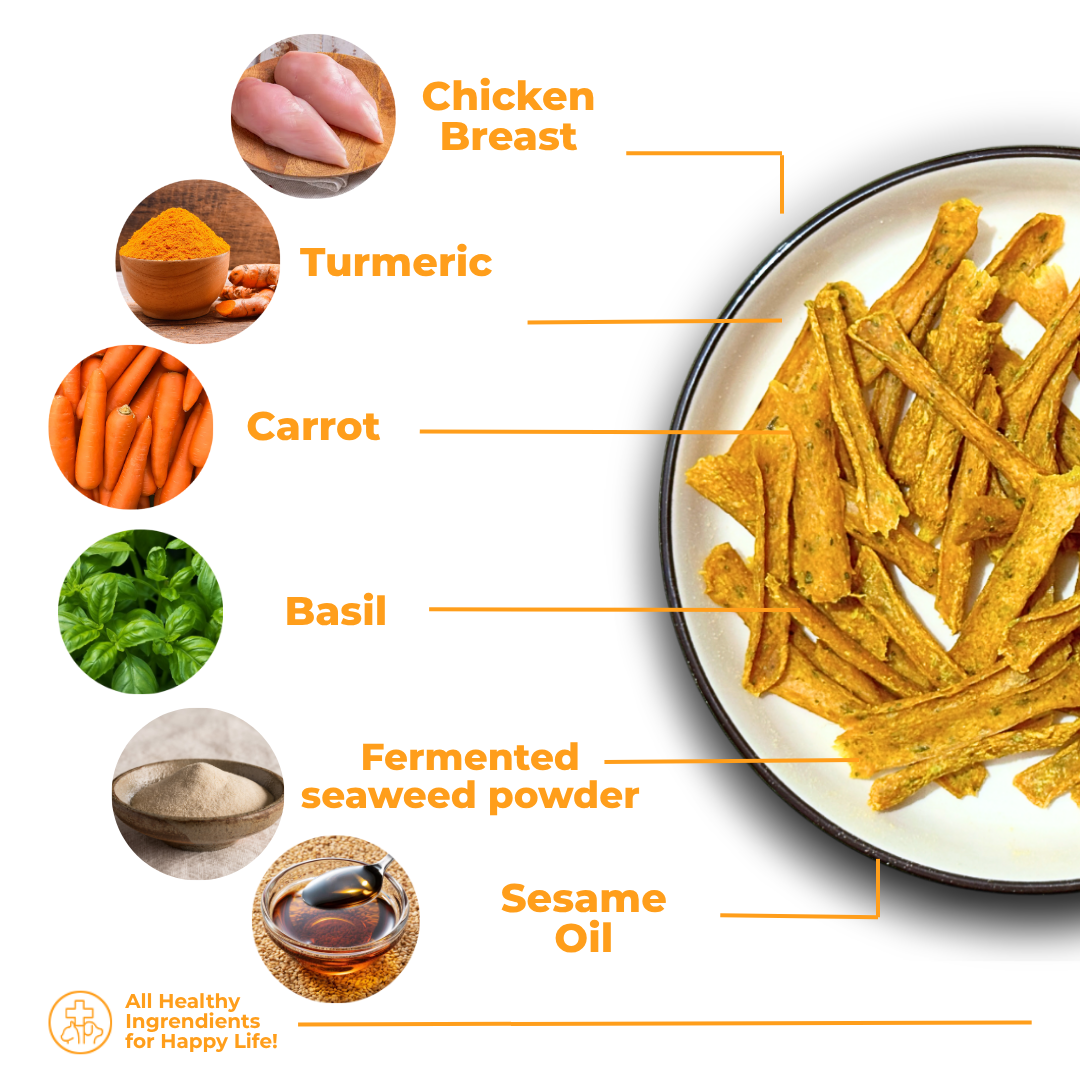 Chicken Breast, Carrot, Turmeric, Basil, Sesame Oil, Fermented Seaweed Powder.